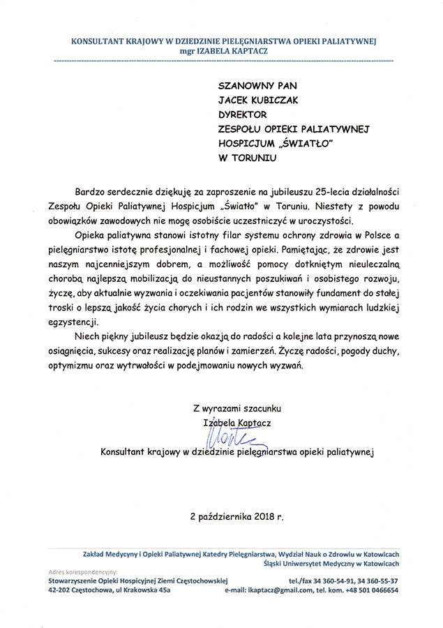 Z okazji tak znamienitego jubileuszu Hospicjum „Światło” otrzymało również szereg listów gratulacyjnych, m.in. od Mikołaja Bogdanowicza – Wojewody Kujawsko-Pomorskiego, Piotra Całbeckiego – Marszałka Województwa Kujawsko-Pomorskiego, Michała Zaleskiego – Prezydenta Miasta Torunia, Marcina Czyżniewskiego – Przewodniczącego Rady Miasta Torunia, Jarosława Radacza – Burmistrza Brodnicy, Piotra Boińskiego – Starosty Brodnickiego, Izabeli Kaptacz – Konsultanta krajowego w dziedzinie pielęgniarstwa opieki paliatywnej, Grażyny Śmiarowskiej – Dyrektor Zakładu Pielęgnacyjno-Opiekuńczego im. ks. Jerzego Popiełuszki, a także Małgorzaty Zawirowskiej – Przewodniczącej Okręgowej Rady Pielęgniarek i Położnych we Włocławku.